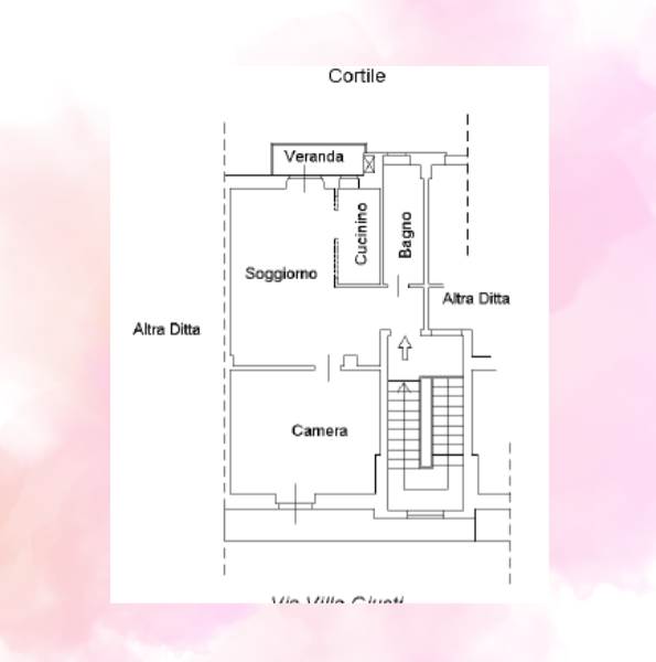 Alloggio al piano quinto (6° f.t.) composto di ingresso, soggiorno con cucinino, una camera, bagno e veranda, annessa cantina al piano sotterraneo. stabile privo di ascensore.